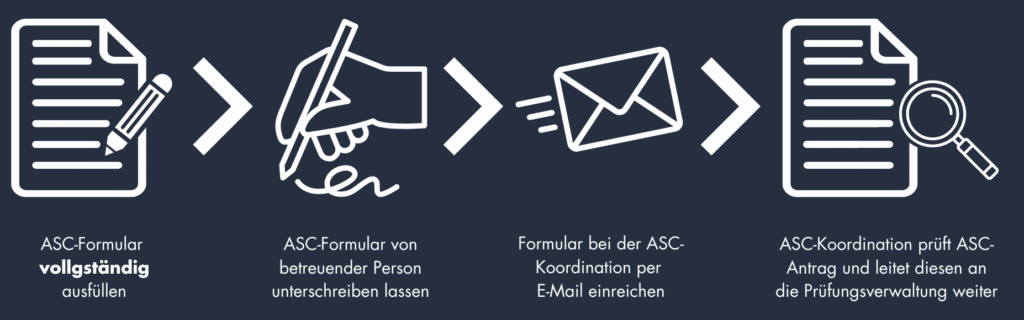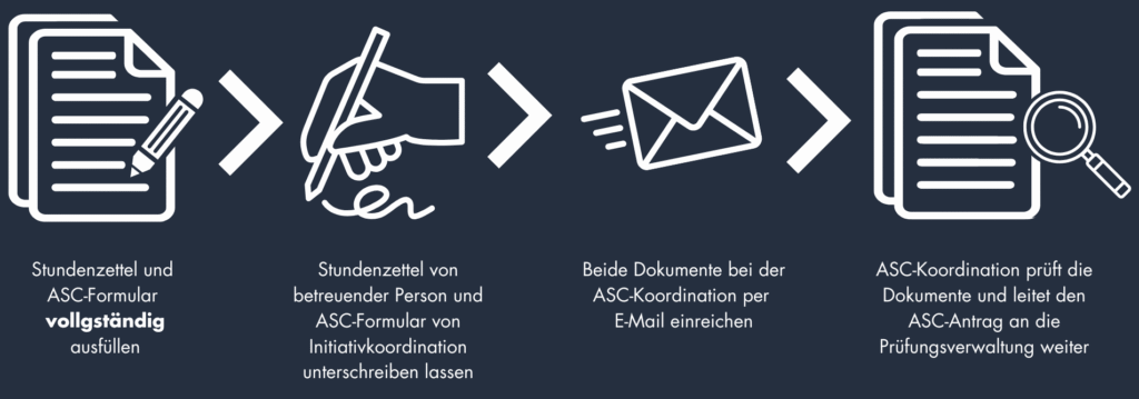Keine Sorge – ASC können jederzeit und unabhängig von der Prüfungsanmeldung angerechnet werden. Wichtig ist nur, dass du deinen Antrag vollständig einreichst, dann kümmern wir uns um den Rest. Denk bitte dennoch daran, den Antrag rechtzeitig einzureichen.